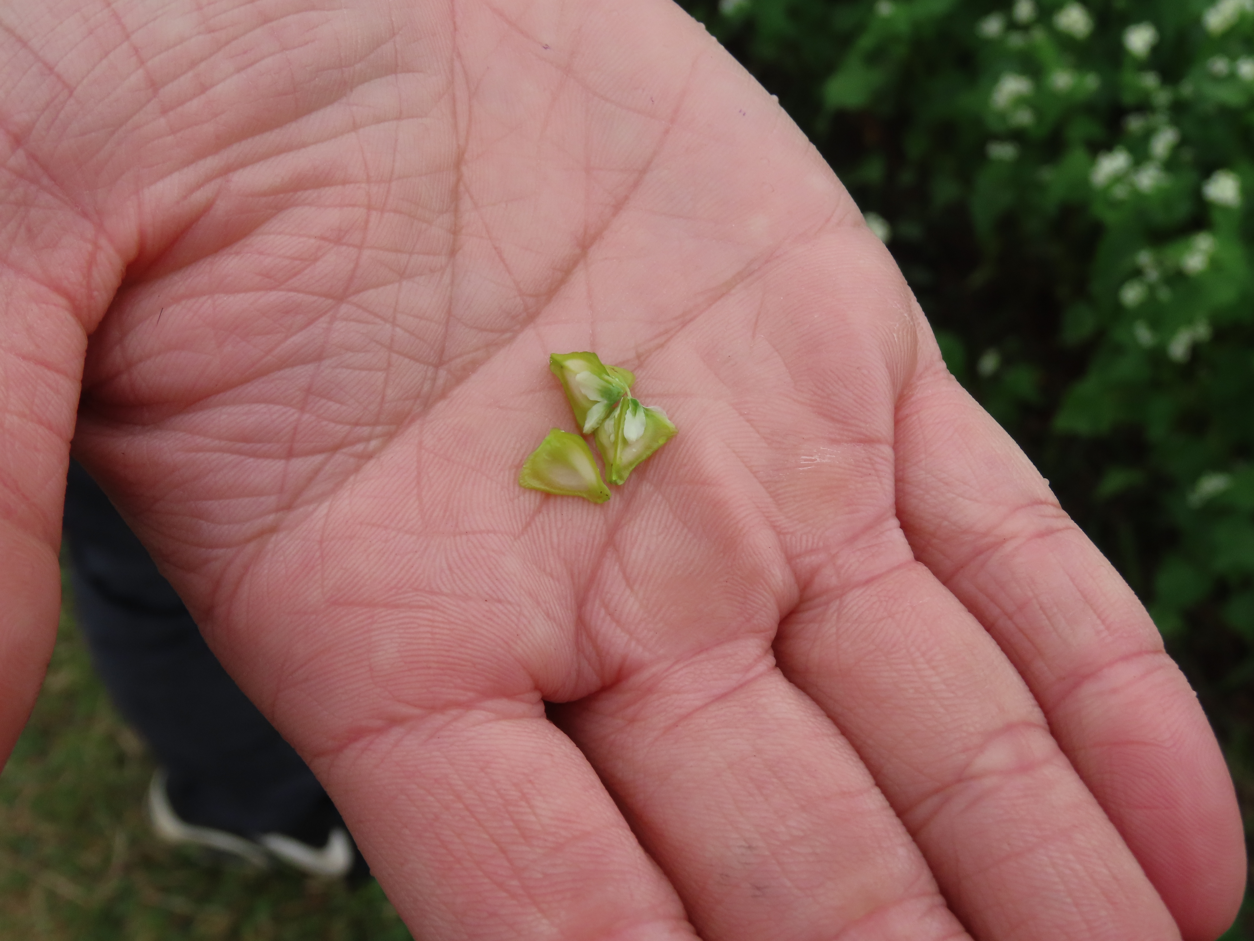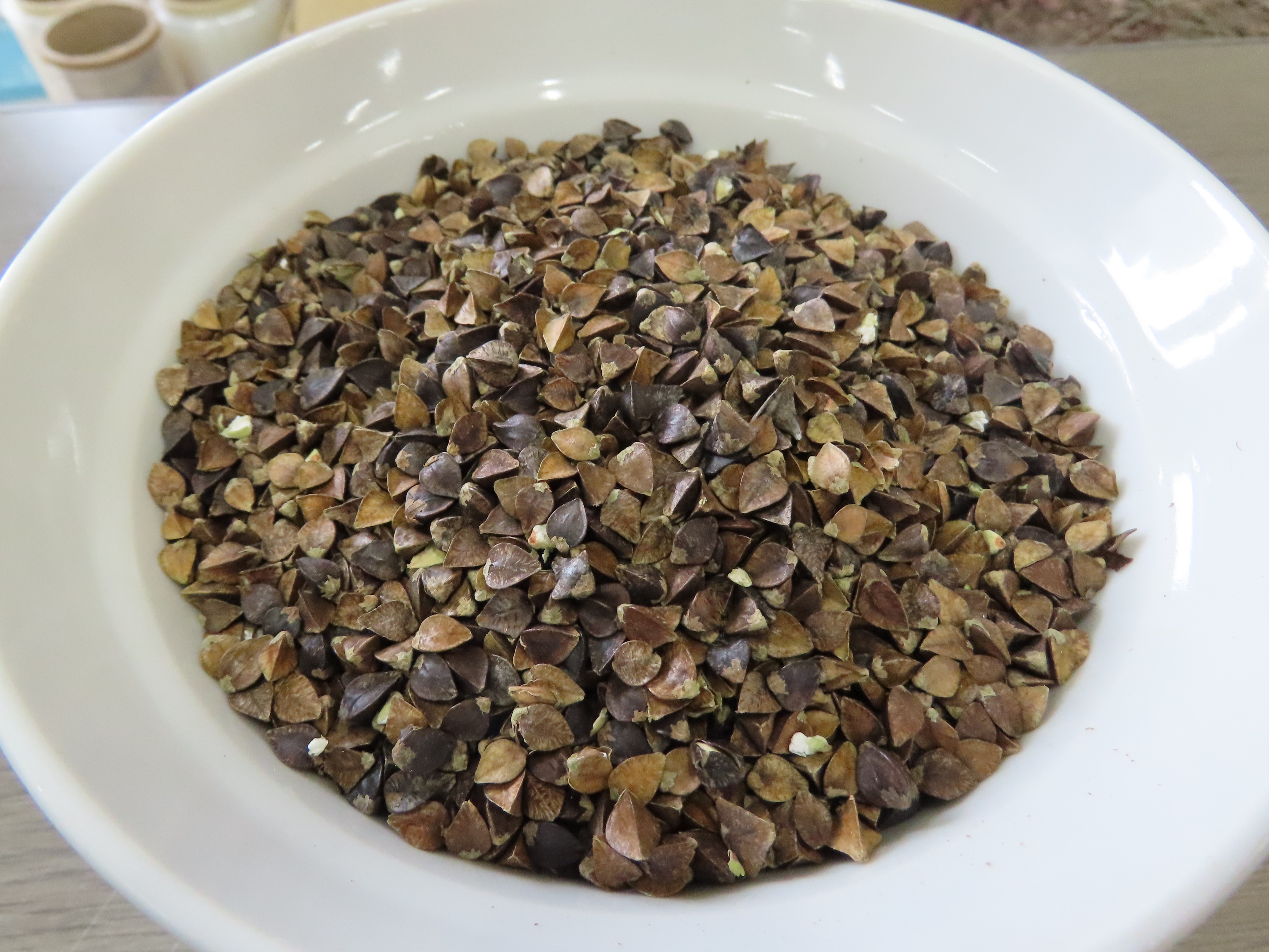 収穫前のそばの実は緑色をしています。それが次第に色付き、収穫期になると身が少し膨らんで、殻が濃い茶色に変化します。硬い殻を剥がした中身は白く、手で触るだけで粉状になります。製粉は市内の工場で行なっています。裾野そばを製粉する際は、殻を取り除くだけでなく、中身の甘皮の部分も削り取ります。そうすることで、喉越しが良くなるそうです。