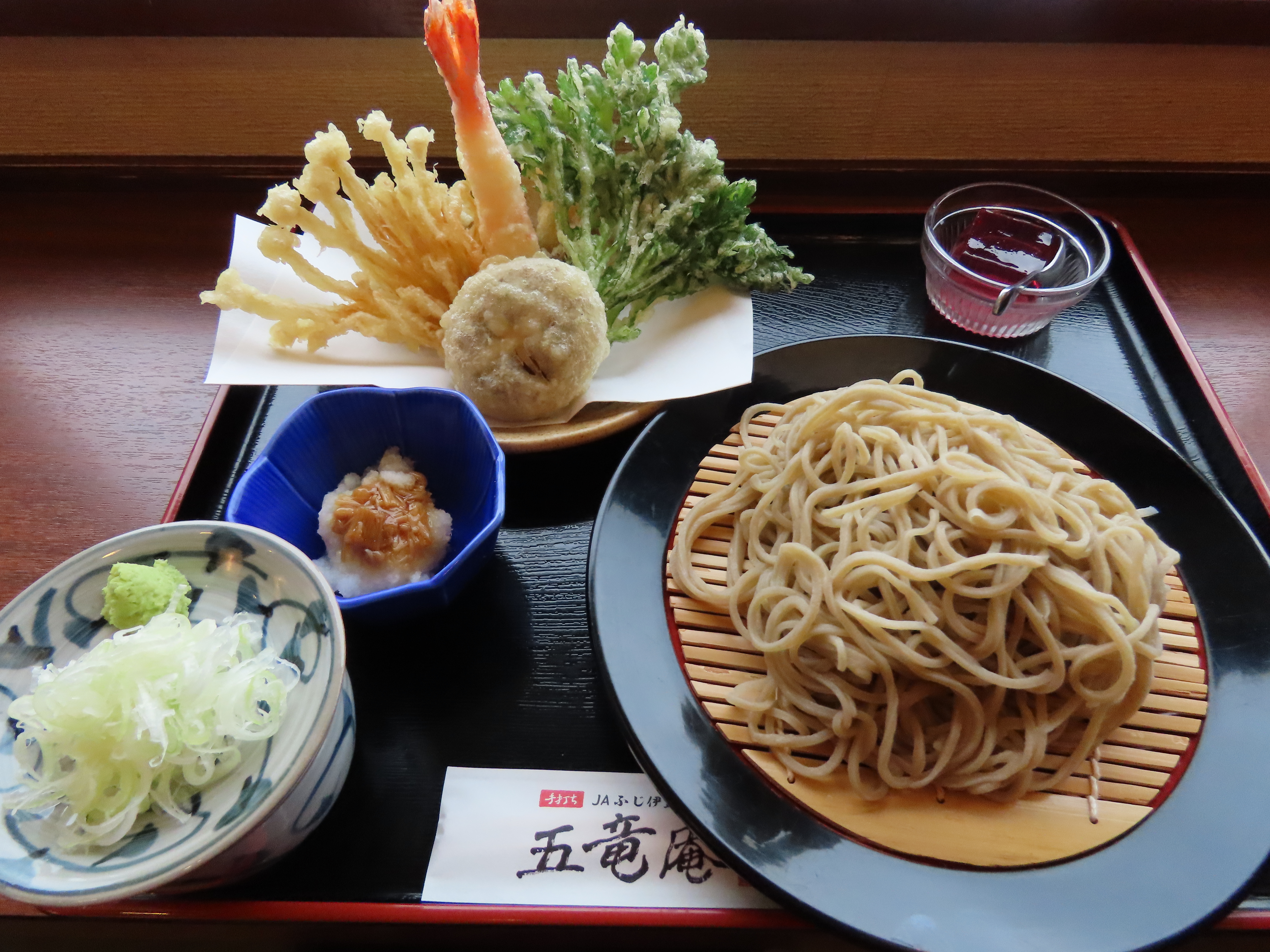 裾野そばは、年間10〜12トンが生産されていますが、そのうちの約8トンがJAふじ伊豆直営のそば店「五竜庵」で消費されています。近くにある観光スポット「五竜の滝」にちなんで名付けられており、窓の外には美しい富士山を望むことができます。