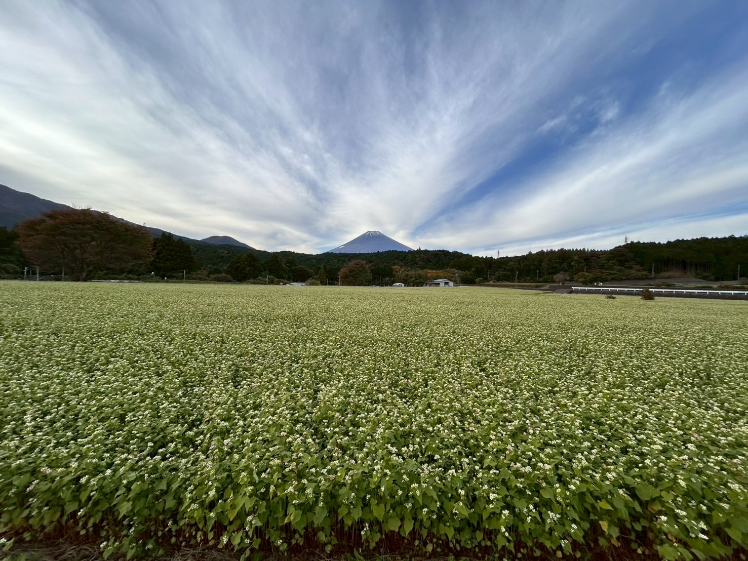 静岡県東部、富士山の南麓に広がる裾野市。訪ねたのは、10月後半でちょうど新そばの収穫前の時期。富士山を背景にした広大なそば畑には、かわいい白い花が一面に咲き誇っていました。この地域は、標高が高く、気候が涼しいうえ、水はけの良い火山性の土壌が広がっていることから、かつては庭園やゴルフ場などで使われる芝生の栽培が盛んだったと言います。