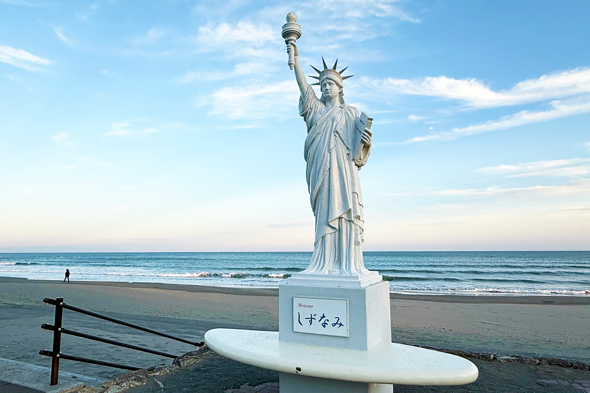 とくに、波質が良い「静波海岸」は、春から秋にかけて全国からサーファーが集まる、サーフィンのメッカ。ビーチには、サーフボードに立つユニークな自由の女神像もあり、訪れる人をほっこり和ませます。