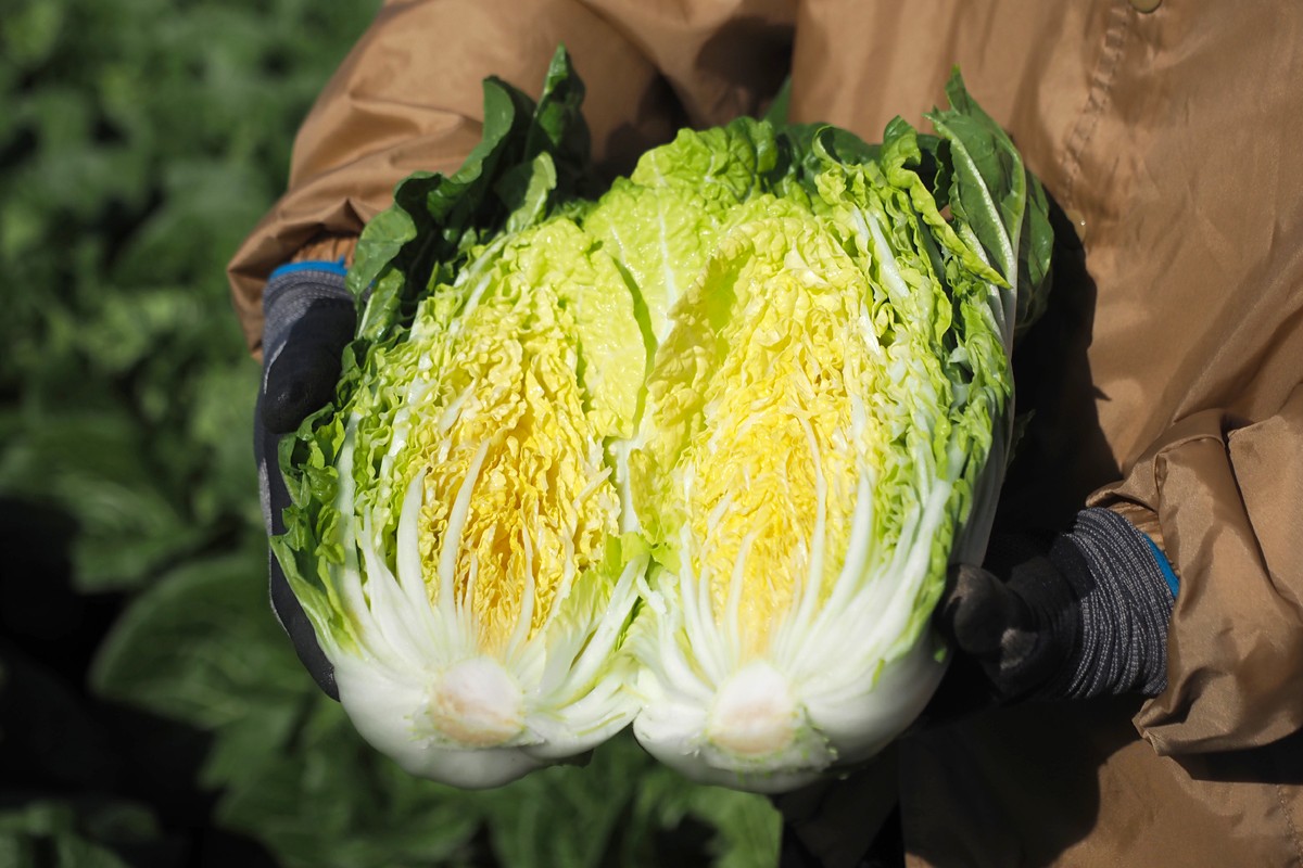 特別に、収穫したばかりの白菜をカットしていただきました。ナイフが入ると、外側の緑と対照的な、鮮やかな黄色い葉が顔を出します。このコントラストの美しさこそ、高品質な証。川崎さんもこの断面を見て、生育が順調だったことを確認します。