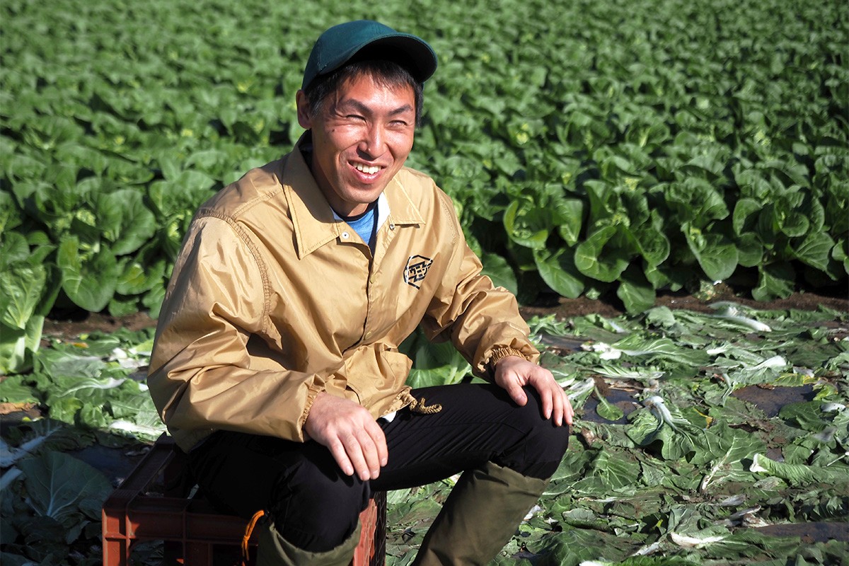 「のうみんず」が栽培するのは、ロメインレタスとミニ白菜の2品目。ミニ白菜をメインで栽培しているのが、塚原地区「ヤマツ川崎農園」代表の川崎耕平さんです。川崎さんは「のうみんず」の初期メンバーの一人でもあります。