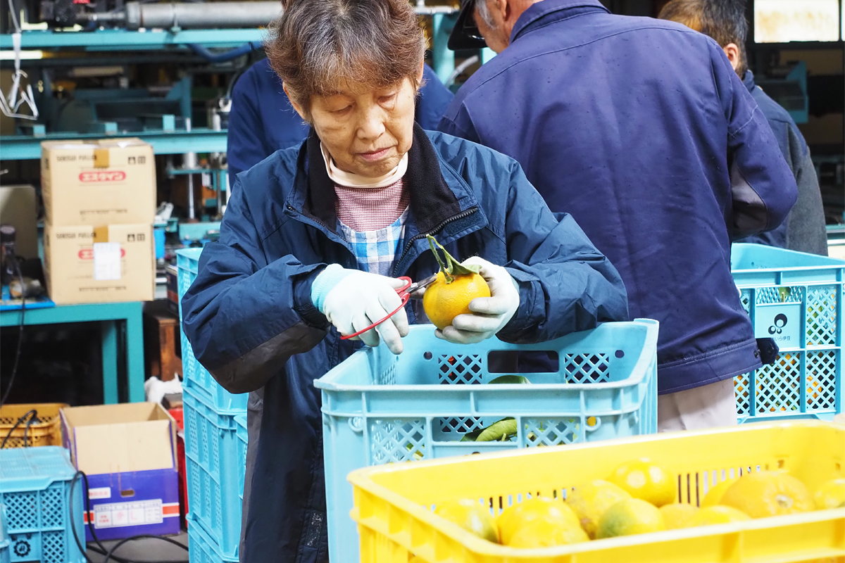 この日訪れたのは、伊東市にあるJAふじ伊豆 あいら伊豆地区の選果場。そこでは山積みになった「枝付き橙」の枝を切り、加工用の原料として整える作業が行われていました。