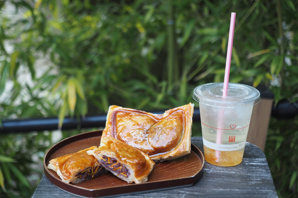 特におすすめなのは、神社直営の「鳥居の結び葉」で楽しめる「結び葉焼き(橙つぶあん)」です。サクサクのパイ生地をふっくら焼き上げ、あんこの甘さと橙の香りが相性ぴったり。さらに、神社に併設する「茶寮・報鼓」で販売している、橙マーマレードが入ったシュワッと爽やかな「橙サイダー」と合わせれば、最高の組み合わせになります。