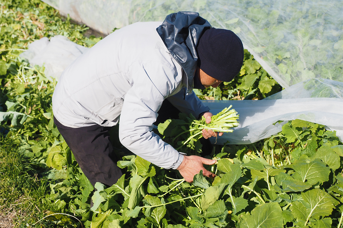 水かけ菜の育ち具合を確かめながら「小指の根元くらいの太さが、いちばんおいしいんですよ」と、伸びた茎(とう)を一つずつ摘み取っていきます。水かけ菜は、葉だけではなく菜の花のように花芽として伸びてくる茎の部分を食べます。そのため、小松菜のように株を丸ごと刈り取るのではなく、一本一本収穫する必要があり、非常に手間がかかります。
