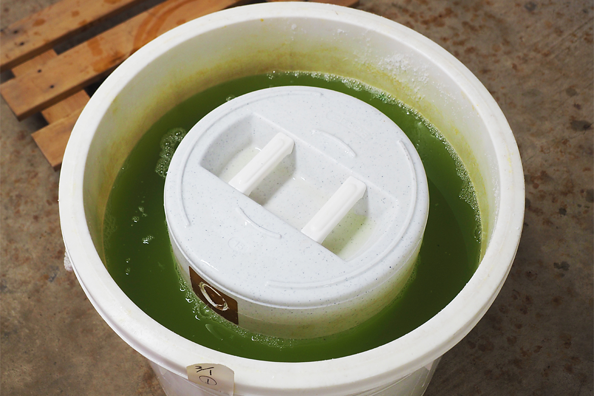 摘みたての茎は、すぐに大きな樽へ。塩だけでシンプルに漬け込みます。樽の中を覗かせていただくと、茎からあふれ出した緑色の水分が満ちていました。
