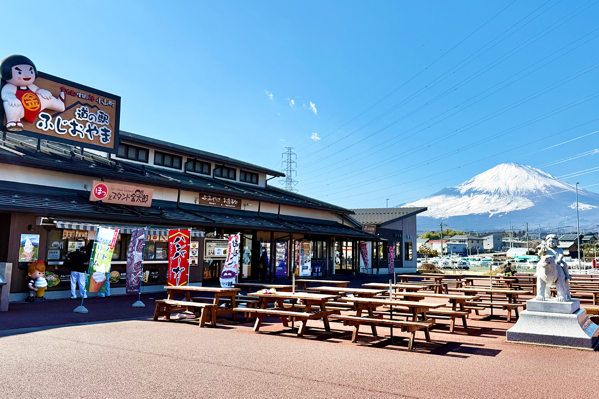 水かけ菜を購入するなら、ぜひ国道246号沿いにある「道の駅ふじおやま」へ。ここは、富士山を目の前に望む絶景スポット。「金太郎のふるさと」としても有名で、ドライブやツーリングの定番の休憩場所になっています。