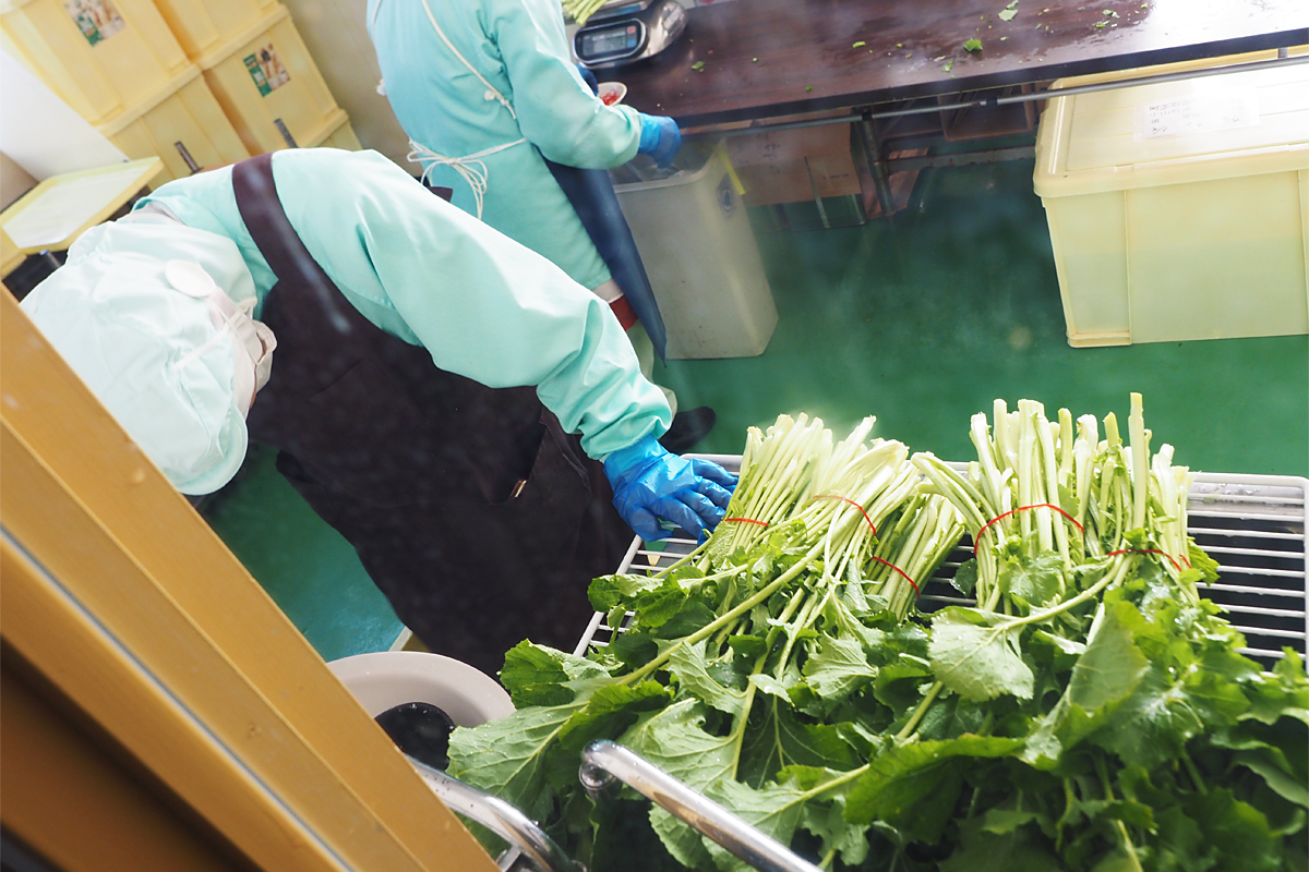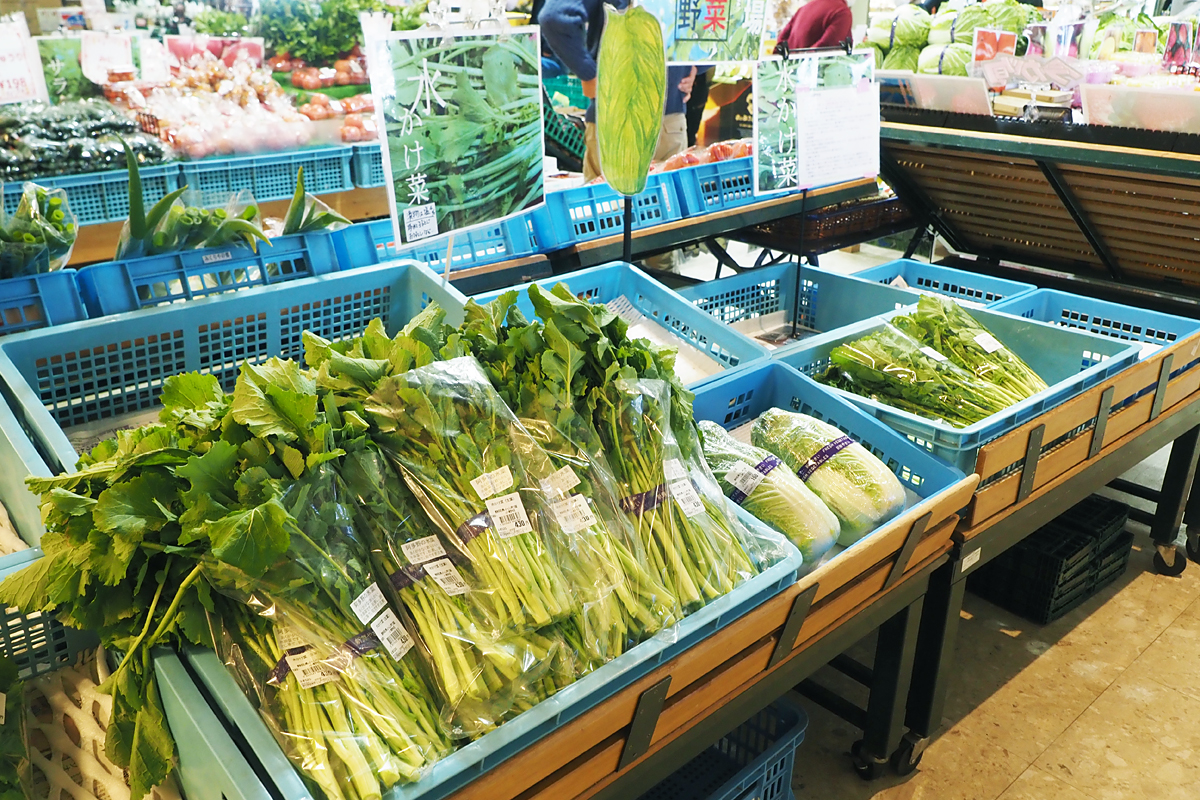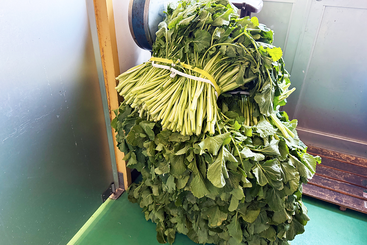 館内の直売所には、毎年2月上旬から3月上旬ごろまで、生の水かけ菜が店頭に並びます。阿多野の水かけ菜は“ブランドもの”として知られ、その味をよく知る地元の人たちは迷わず手に取っていきます。