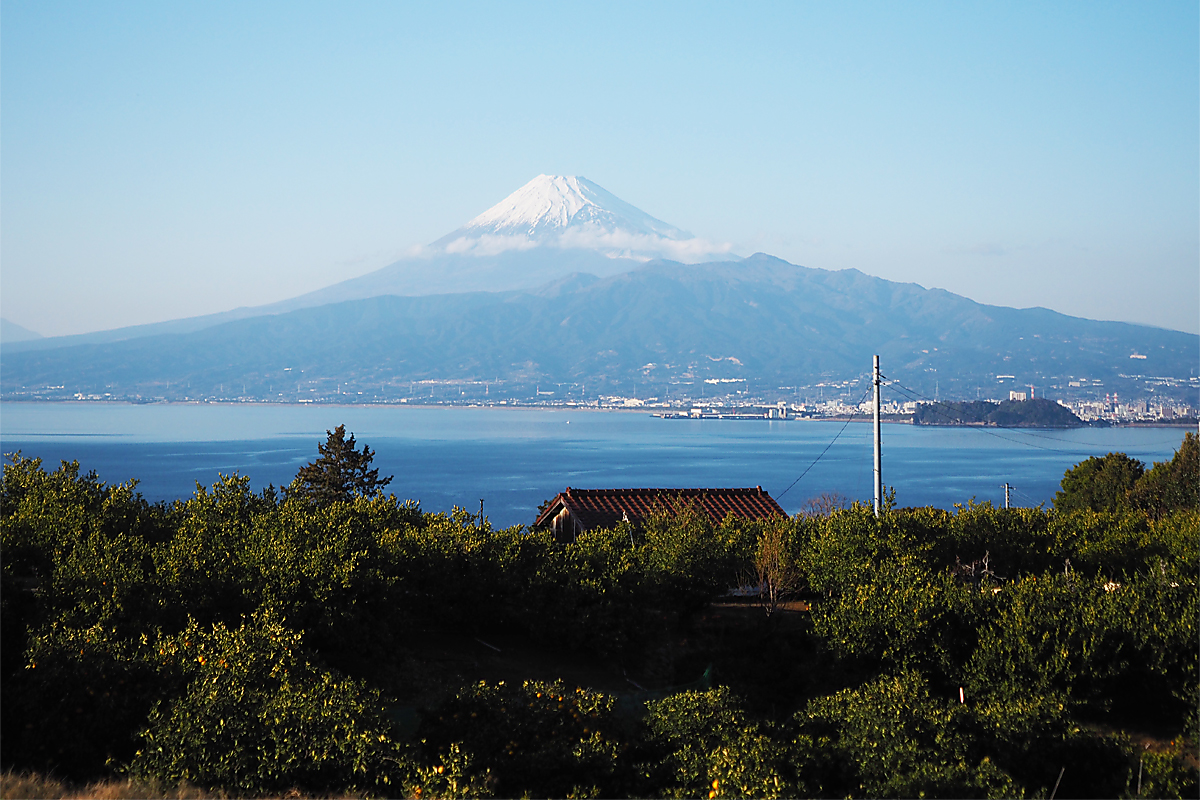 沼津市の中心部から駿河湾に沿って南下し、最高級みかん「寿太郎」のふるさと・西浦地区へ。目の前には穏やかな駿河湾が広がり、背後には横たわる愛鷹山と、どっしり構える富士山が。海と山に抱かれたこの一帯は、“静岡の宝”と呼ぶべき景色が広がり、日々の暮らしにそっと寄り添っています。