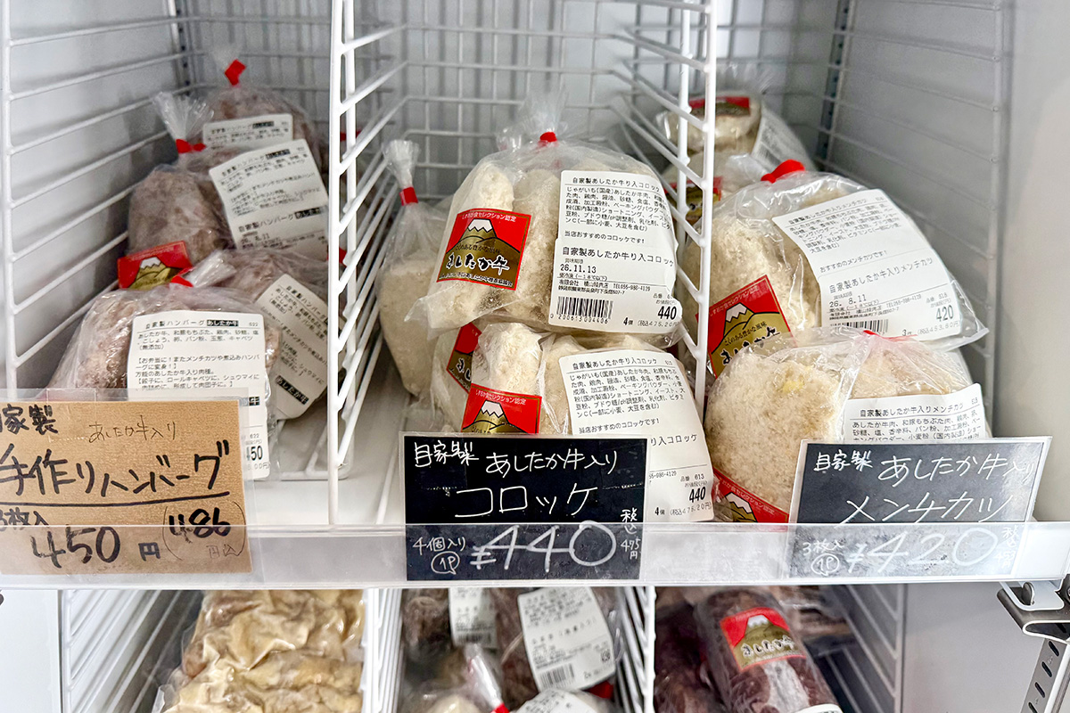 手づくりのお惣菜が並ぶなか人気は、あしたか牛の旨みが溶け込んだ「コロッケ」と「メンチカツ」。なかでも、ひき肉がぎゅっと詰まった「100%ギッシリメンチ」は、手間暇かけて仕込むこだわりの逸品です。