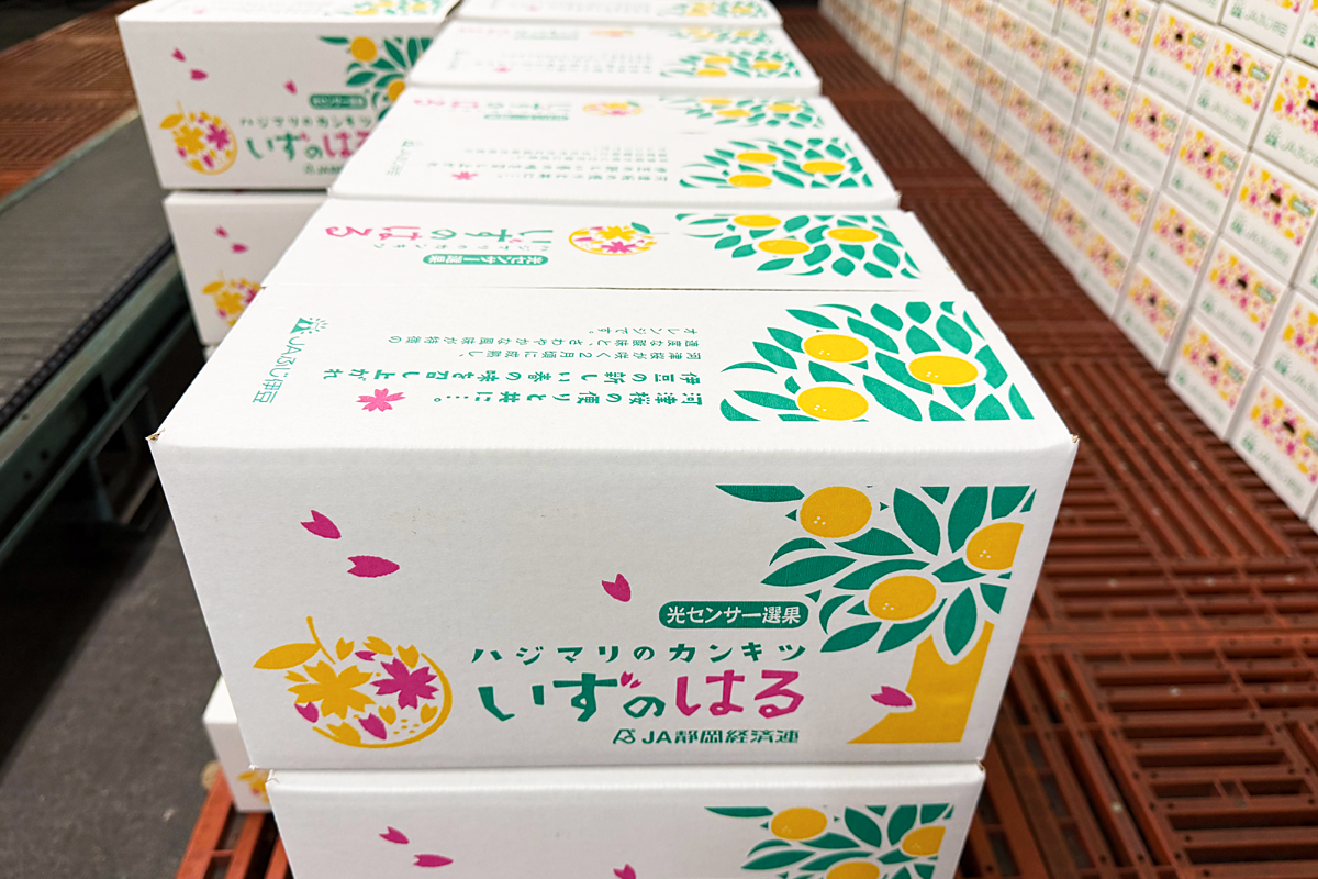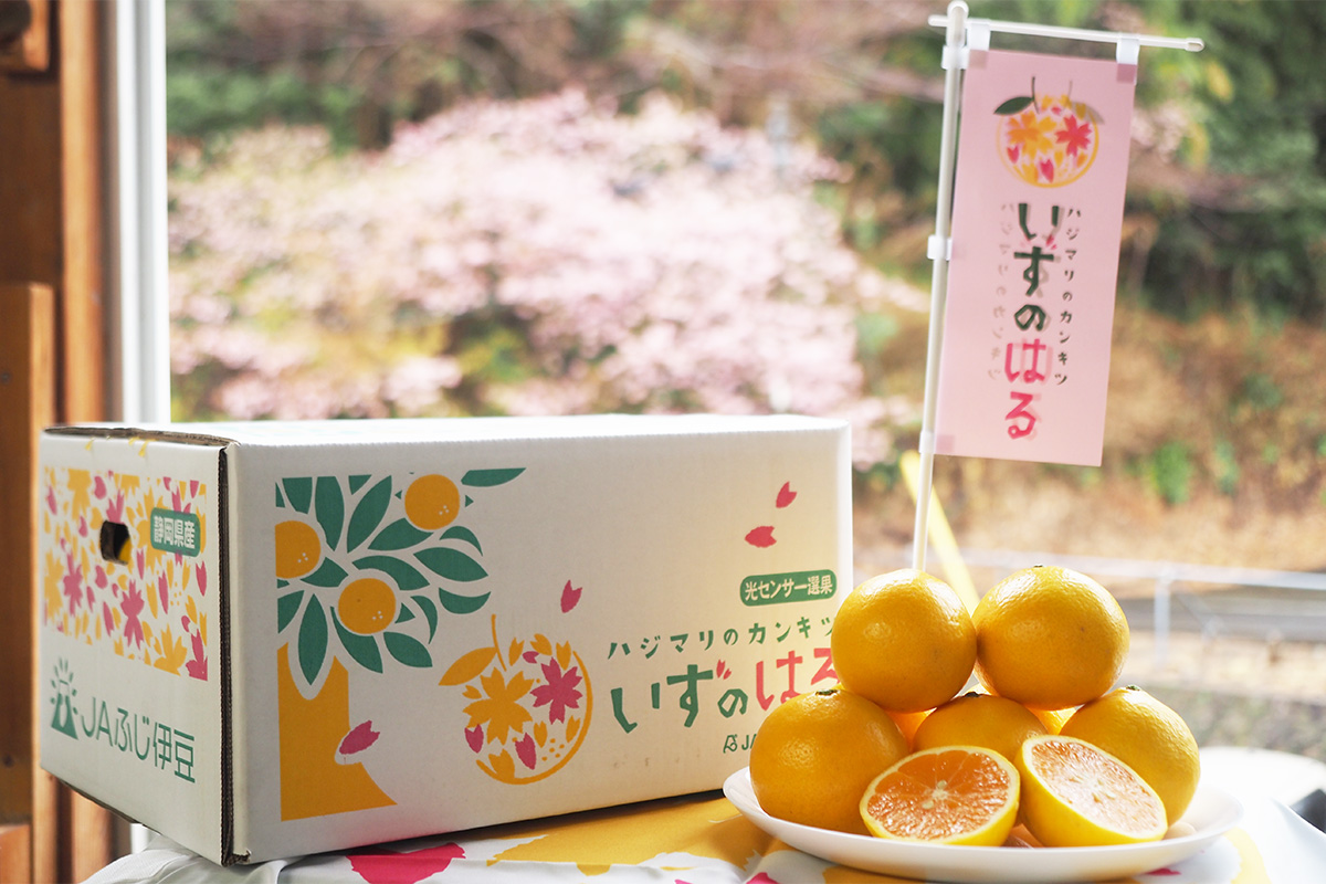 出荷用の段ボールには、山吹色の果実と河津桜のイラストとともに、「ハジマリのカンキツ、いずのはる」という文字が躍ります。河津桜と同じ頃に旬を迎え、春のはじまりを告げる柑橘にぴったりのキャッチコピーです。