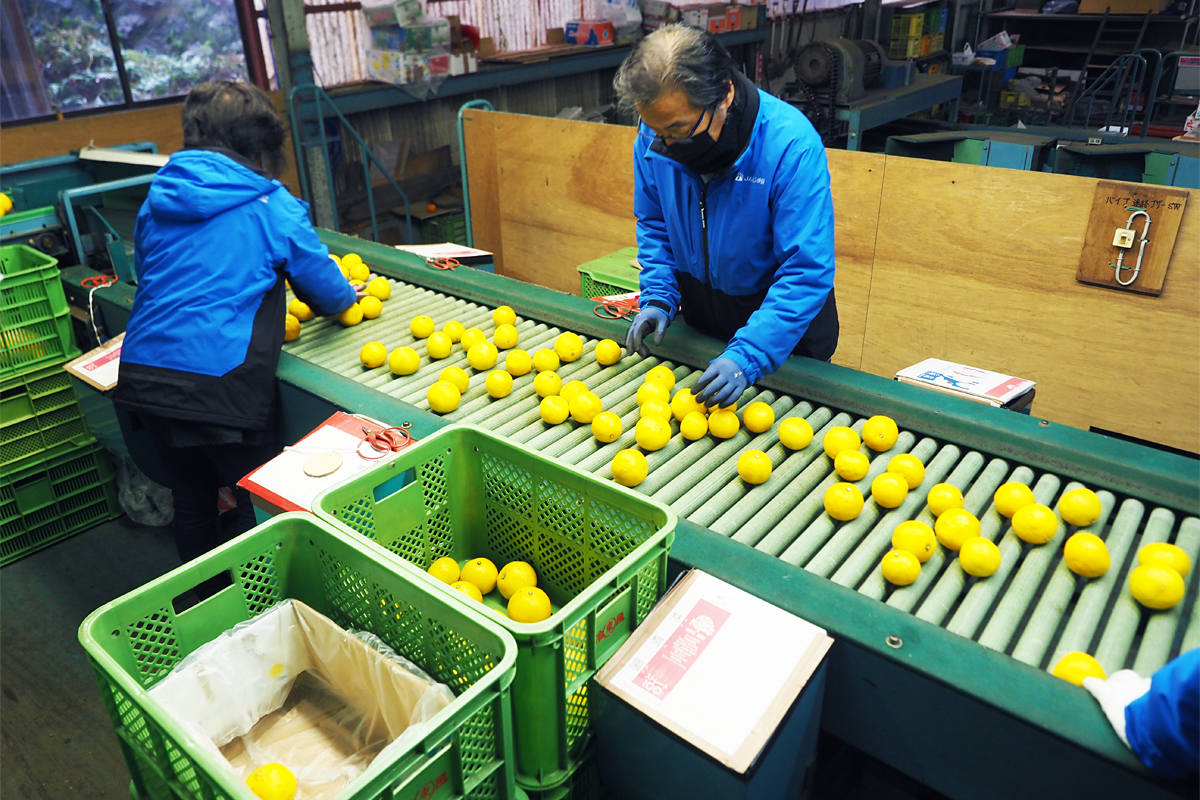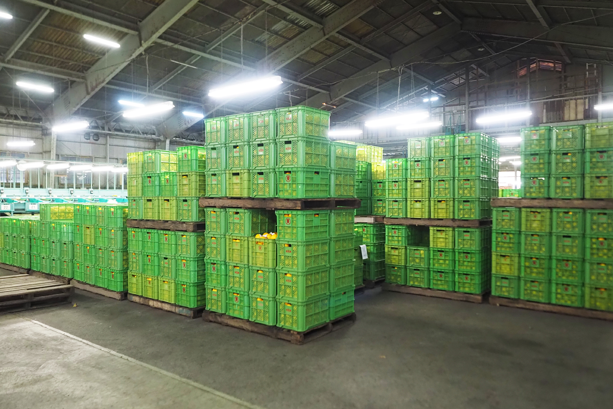 取材当日、河津町にあるJAふじ伊豆 柑橘第一共選場を訪れると、生産者から届けられた「いずのはる」が緑のコンテナに山積みになっていました。ここでは週に2回、選別が行われます。
